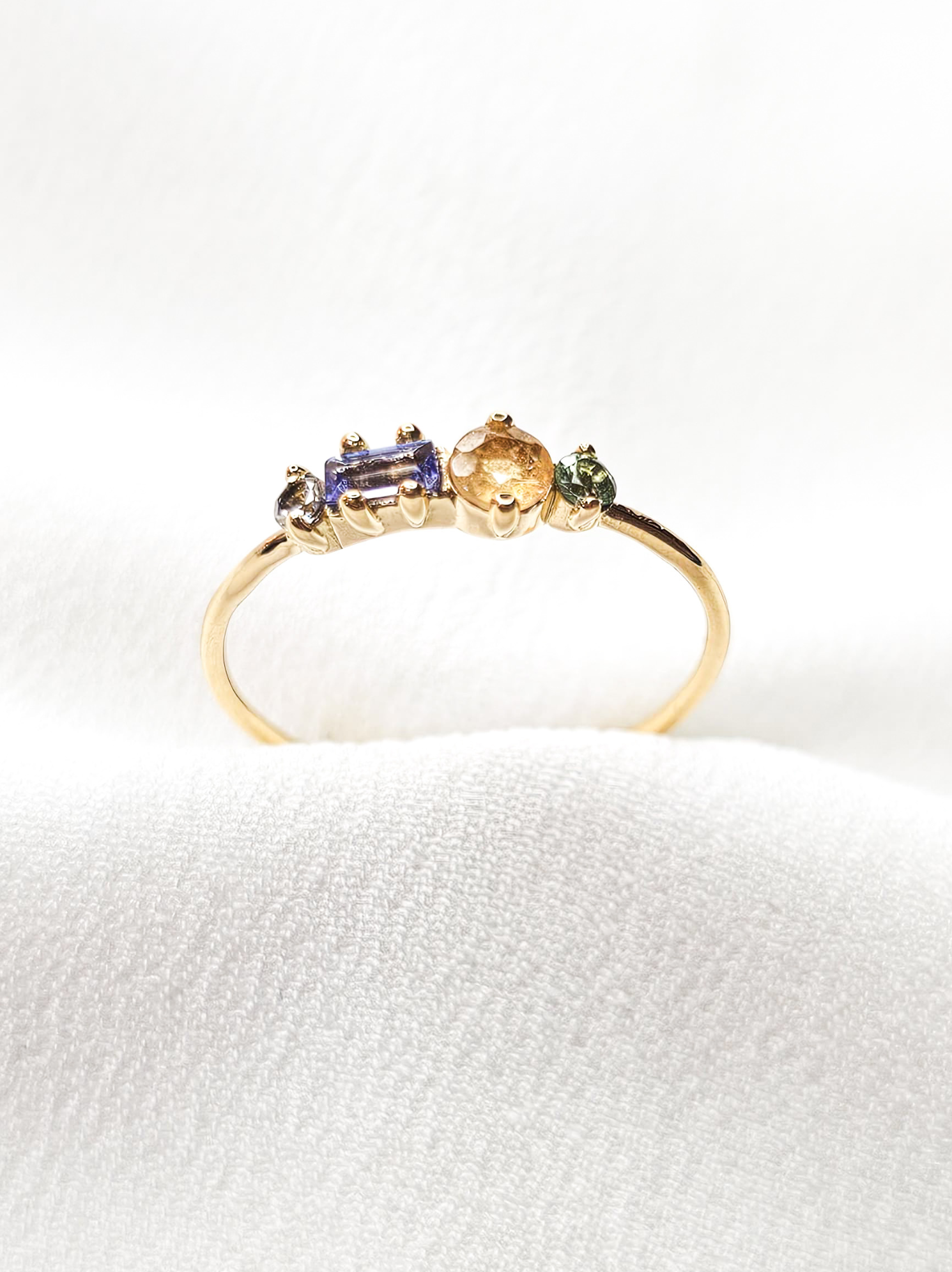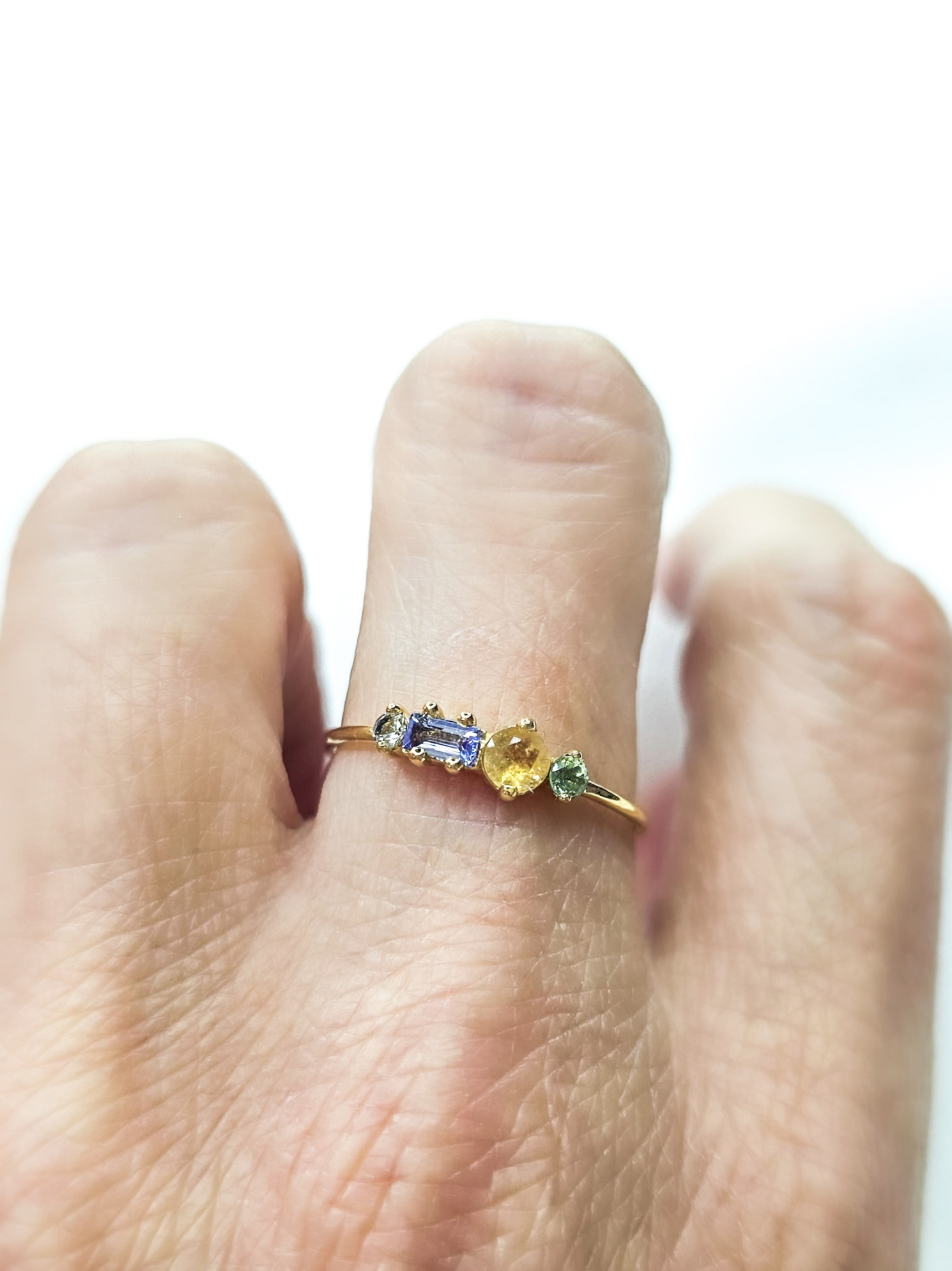• Anillo con Tanzanita, Turmalina naranja y verde y Goshenita blanca en oro 18k.