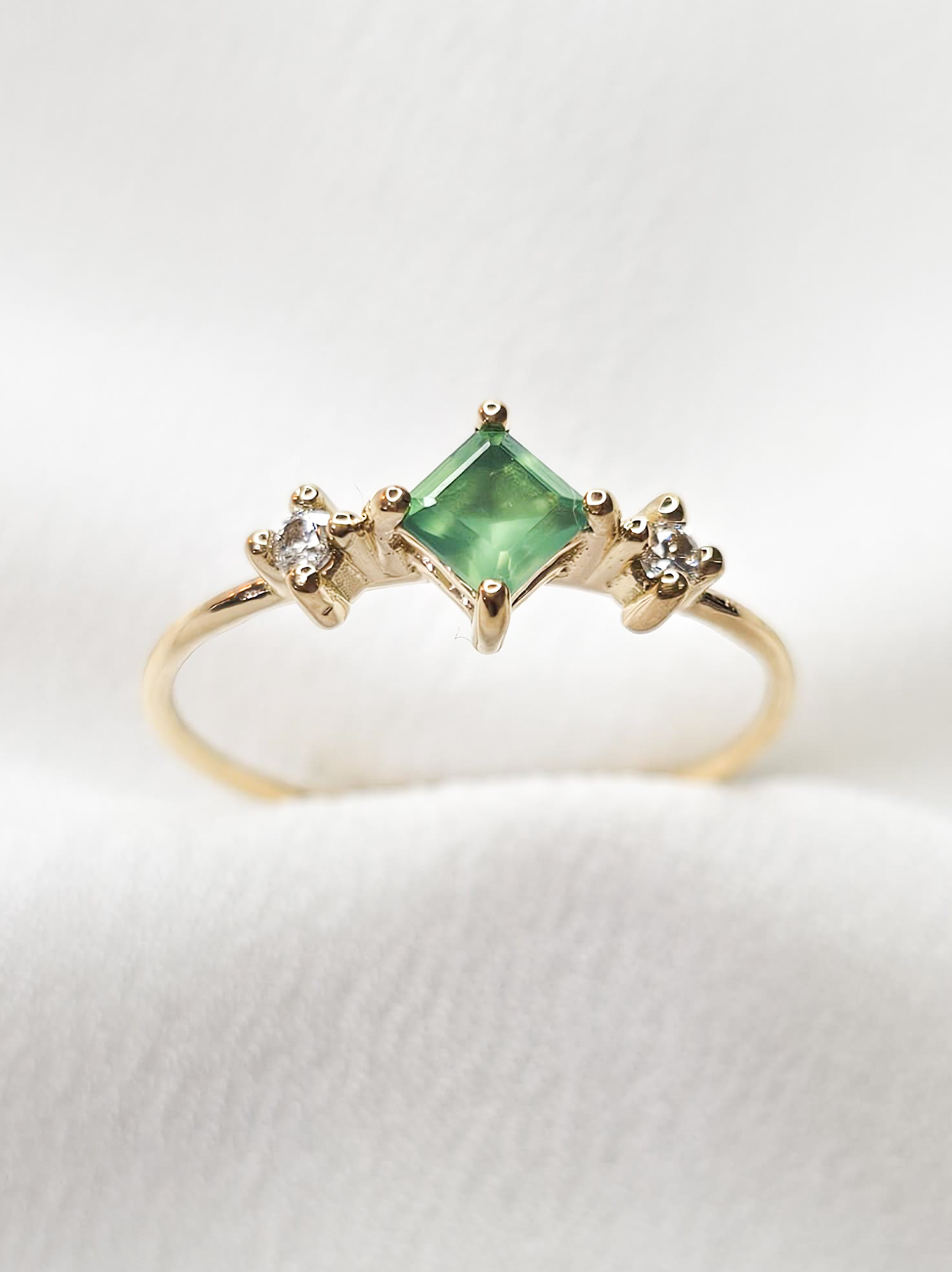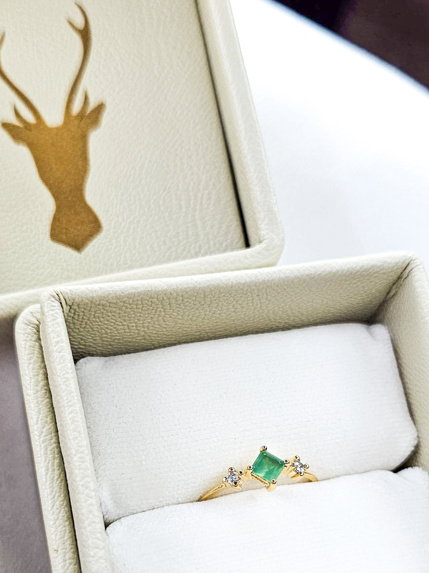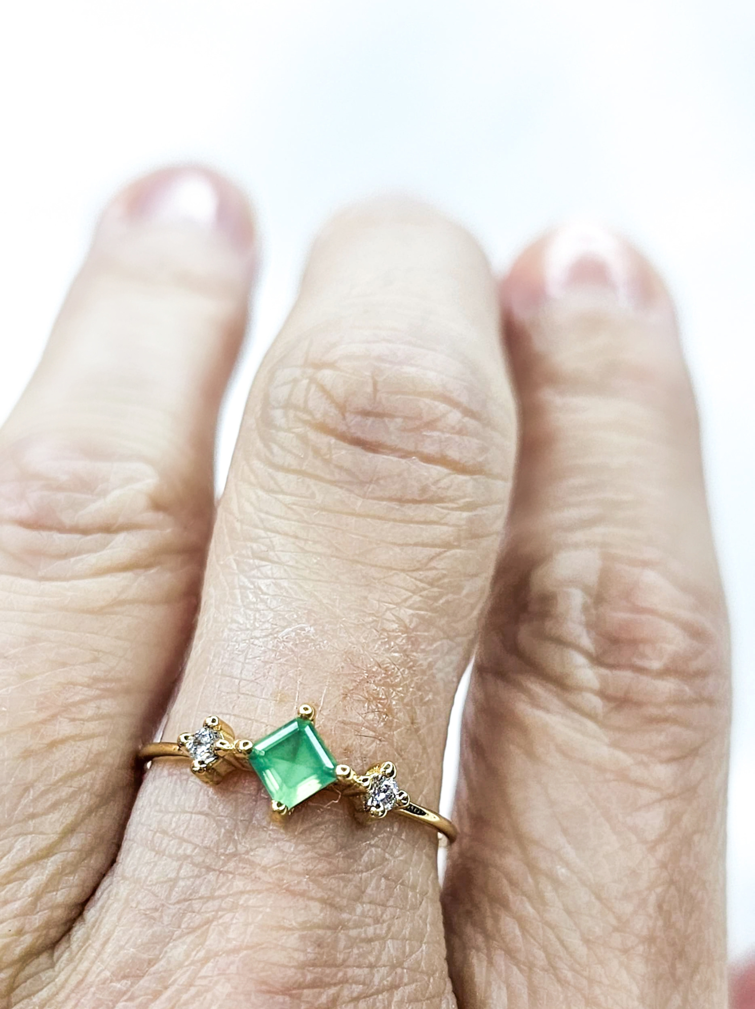 - Anillo con calcedonia verde y dos piedras cubic blancas en oro 18k.